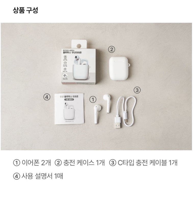 다이소 매장에서 5,000원에 구입했습니다. 깔끔한 패키지와 직관적인 설명이 돋보였고, 구성품은 이어폰 본체와 충전 케이스, 간단한 사용 설명서, 그리고 충전 케이블로 이루어져 있었습니다.
