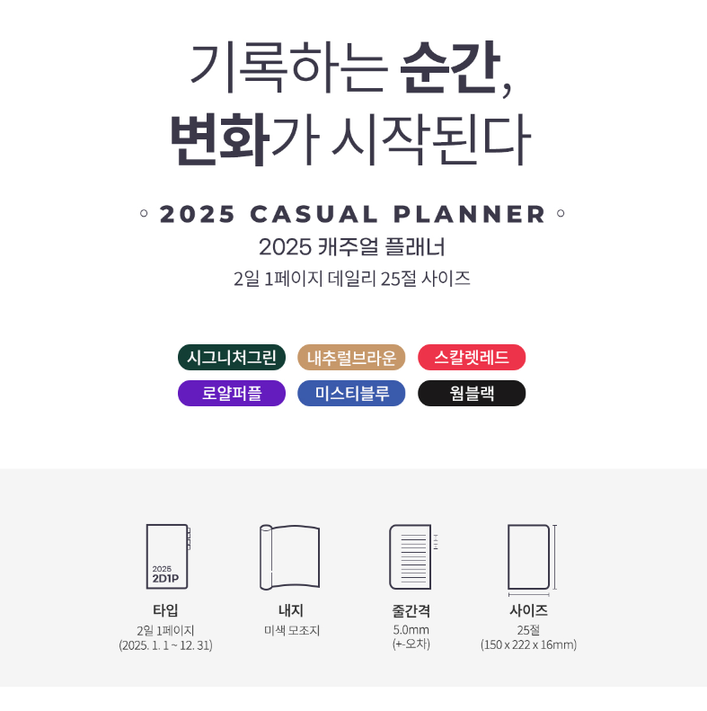부드러운 색감과 감각적인 폰트가 돋보이는 모노로그 다이어리는 감성적인 기록을 좋아하는 분들에게 강력 추천하는 2025년 다이어리입니다.